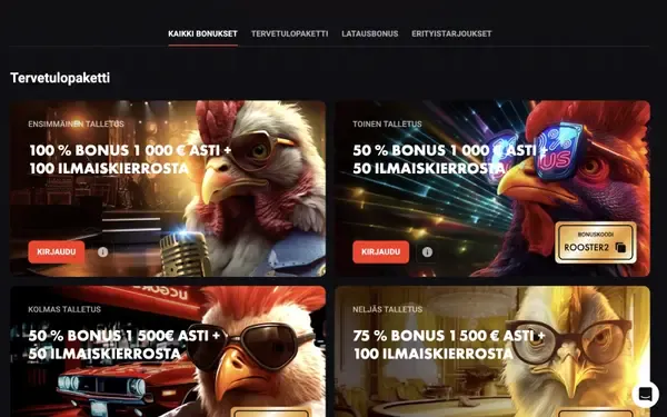 Tervetuliaistarjouksen lisäksi RoosterBet-kasino tarjoaa aikataulutettuja reload-bonuksia ja päivittäisiä palkintoaktiviteetteja. Lue aina kampanjasivulta peliosuudet (contribution) ja ilmaiskierrosten ehdot, sillä ne voivat vaihdella tarjouksittain. Jos etsit nimenomaan RoosterBet-kasinon talletusvapaata bonusta, huomioi, että listaamme tällaiset tarjoukset vain, jos ne ovat aktiivisia Kampanjat-sivulla; emme väitä, että sellainen olisi aina saatavilla.
