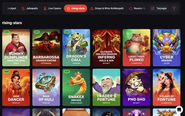 Kolikkopelilobbymme on rakennettu nopeaan selailuun, ja sieltä löytyy kategorioita kuten uutuudet, Buy Bonus -pelit, Megaways-tyyliset mekaniikat, klusterimaksut sekä klassiset rullat. Jos etsit RoosterBet-kolikkopelejä, voit lajitella pelit pelintarjoajan ja volatiliteetin mukaan, ja avata sitten pelisäännöt nähdäksesi voittolinjat, bonuksen laukeamisen, RTP:n sekä studion ilmoittaman enimmäisvoiton (x). Tarjoamme myös RoosterBet-kasinon kolikkopelejä jättipottipelien rinnalla, joten voit yhdistää peruspelaamisen peleihin, joissa on suuremmat palkintopotit.